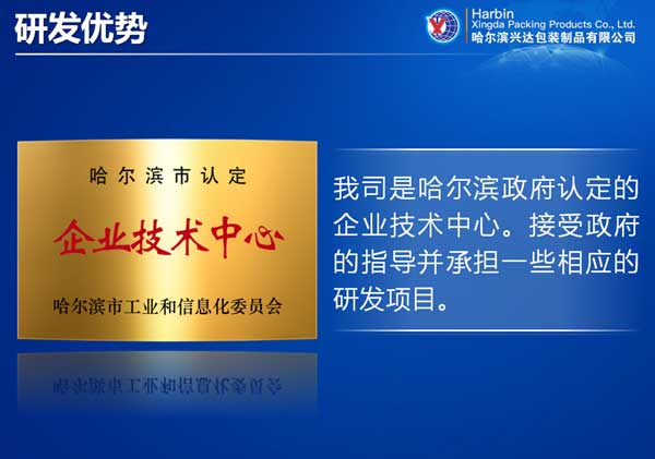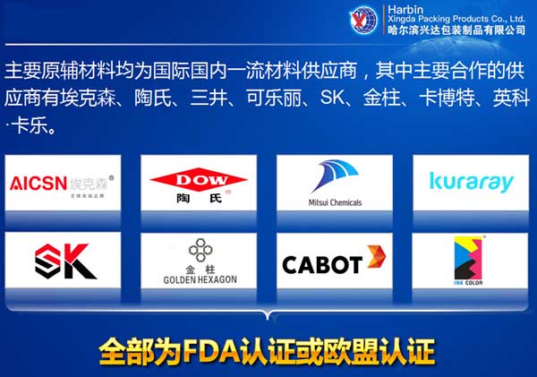 哈尔滨兴达包装制品有限公司是黑龙江省高科技民营企业,主要生产销售各类软包装制品,产能一万吨。产品广 泛应用于食品、医药、化工、轻纺等领域,特别是液体包装和高阻隔、耐高低温包装更是本公司的强项产品,具 有品种全、适用范围广、印制精美、环保等特点。